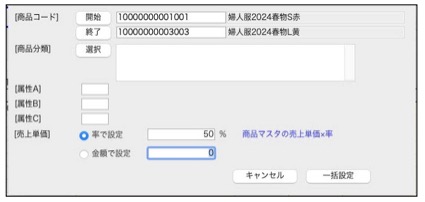 *「商品一括設定」ボタンをクリックすると、設定したい商品マスタの絞り込み、マスタに登録されている「売上単価」から「率」(商品マスタの「売上単価×率」)