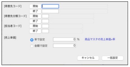 *「得意先一括設定」ボタンをクリックすると、設定したい得意先マスタの絞り込み、マスタに登録されている「売上単価」から「率」(商品マスタの「商品マスタの売上単価×率」)