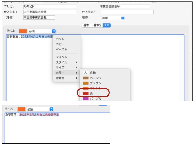 ここで選択した項目ごとの色は、伝票入力時に得意先コードを入力すると、「メモ」の文字色となります。