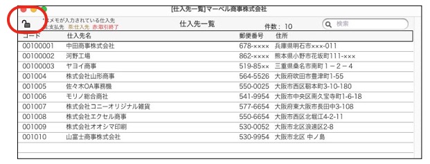 仕入先の変更・削除は、 仕入先一覧画面左上の をクリックし、ロック解除 し、対象の仕入先を