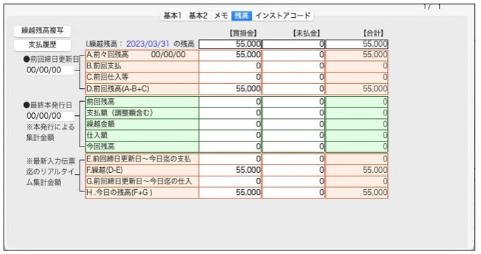 *「A.前々回残高〜H.今日の残高」項目は、支払明細書の本発行・締日更新を行うことで自動的に残高及び発生額は書き換えられます。
