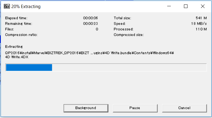 数秒後、圧縮ファイル解凍の進捗状況を示す下図のウィンドウが表示され、解凍が完了すると、このウィンドウは自動的に閉じます