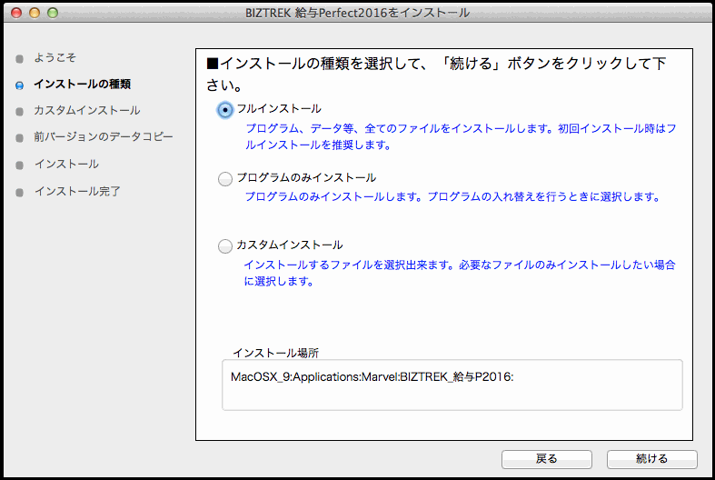 8. インストールの種類を選択する画面で、 v2016のプログラム入替をするときは「○プログラムのみインストール」を、初めてv2016をインストールする場合は「●フルインストール」を選択し、「続ける」ボタンをクリックします。