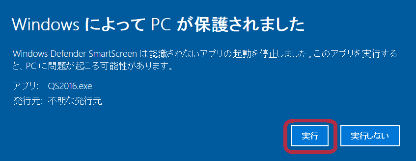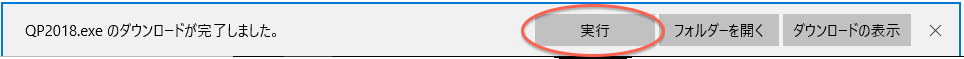 2.しばらくして、ダウンロード用圧縮ファイル(「QP2016exe」)のダウンロードが終わると、下図ウィンドウが表示されますので「実行」をクリックします。