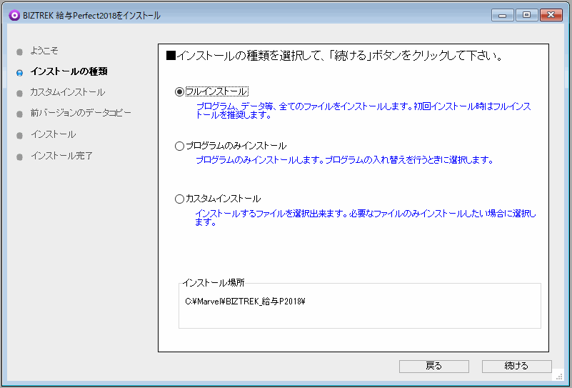 8. インストールの種類を選択する画面で、 v2018のプログラム入替をするときは「○プログラムのみインストール」を、初めてv2018をインストールする場合は「●フルインストール」を選択し、「続ける」ボタンをクリックします。