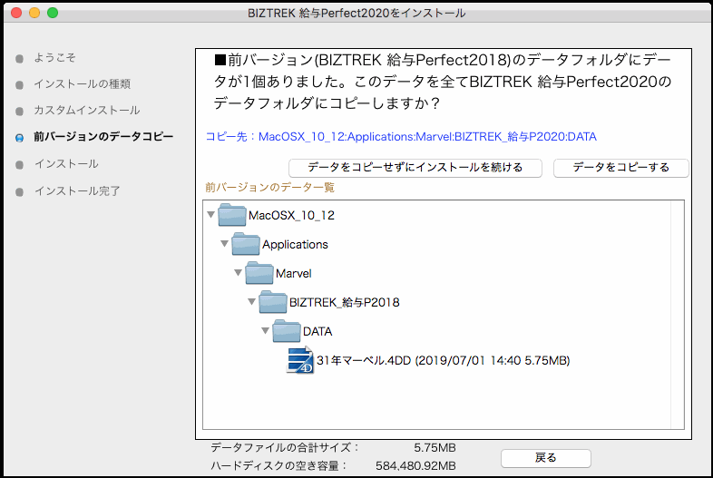 (Mac版) 「ハードディスク」→「アプリケーション」→「Marvel」→「BIZTREK給与P(S)2018」→「DATA」フォルダの中に保存されていれば、v2018の給与データを、今回インストールして作成される v2020の「DATAフォルダへ自動的にコピーする事ができます。この場合、次のような画面が表示されます。
