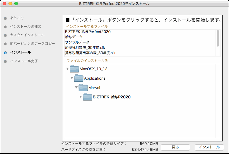 8. ●Mac版:「MacintoshHD」→「アプリケーション」フォルダ→「Marvel」フォルダ→「BIZTREK_給与P(給与S)2020」フォルダが新しく作成されているはずです。