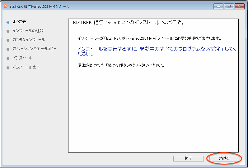 8. インストールの種類を選択する画面で、 v2021のプログラム入替をするときは「○プログラムのみインストール」を、初めてv2021をインストールする場合は「●フルインストール」を選択し、「続ける」ボタンをクリックします。