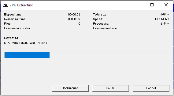 その後、圧縮ファイル解凍の進捗状況を示す下図のウィンドウが表示され、解凍が完了すると、このウィンドウは自動的に閉じます