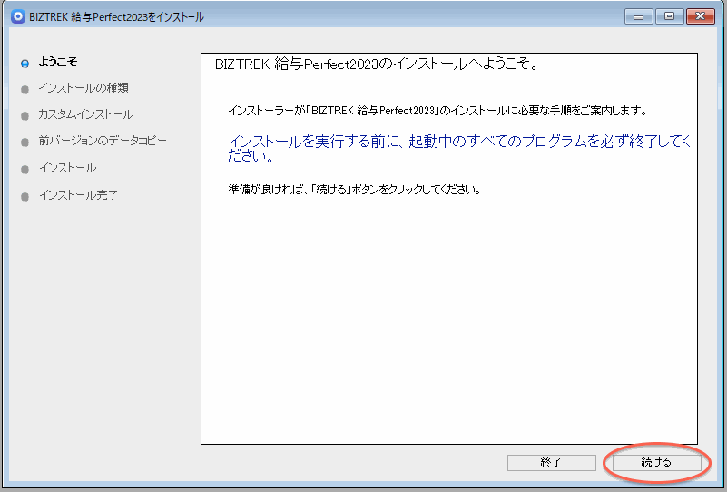 8 インストールの種類を選択する画面で、 v2023のプログラム入替をするときは「○プログラムのみインストール」を、初めてv2023をインストールする場合は「●フルインストール」を選択し、「続ける」ボタンをクリックします。