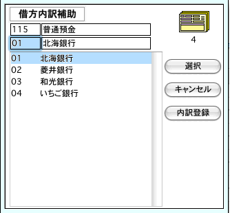 マスター設定の画面などで、項目選択ダイアログが現われる項目(勘定科目登録画面のユーザー設定など)があります。 これは、入力を簡単に、間違いなく行うために用意されたダイアログで、選択肢のどれか1つをクリックするか、『tab』キーを押して項目を選択します。