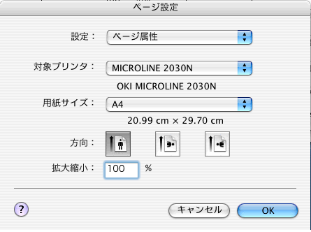 ●下図はOKI MICROLINEのプリンタ設定ダイアログです。大部分の帳表はA4縦方向100%でレイアウトされています(一部A4横)。 この画面で『縮小率』の変更ができます。 「OK」ボタンクリックで、ページ指定ダイアログに進みます。