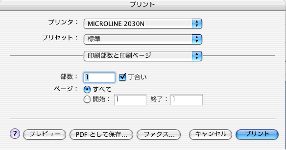 ●「印刷」ダイアログは、使用するプリンタによって違いますが、おおむね『印刷部数』『印刷頁範囲指定』、『プレビュー(印刷帳票を画面に表示)』などが設定できます。