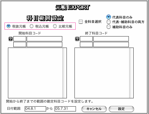 ■元帳EXPORT画面で、科目コード範囲、代表科目・補助科目等を入力(選択)します。