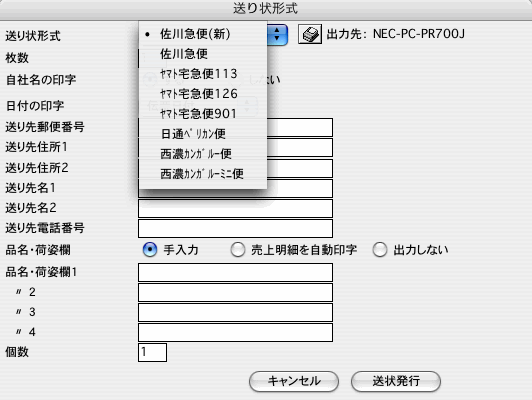 ●売上伝票入力画面から、佐川急便・ヤマト宅急便・日通ペリカン便・西濃カンガルー便・を発行することができます。また、未発行伝票一覧画面・得意先一覧画面から、送り状の一括発行をすることができます。