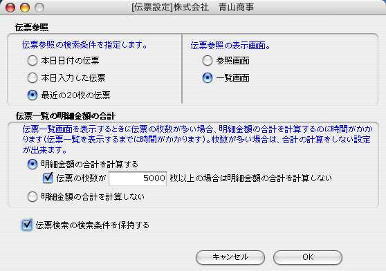 伝票枚数が多くなる場合、明細金額の合計を計算すると時間がかかる為、「計算する」「計算しない」の選択ができます。又。「計算する」を選択した場合でも、「伝票枚数が何枚以上の場合は計算しない」と設定することが出来ますので、一覧枚数が少ない場合のみ計算をする設定も可能です。