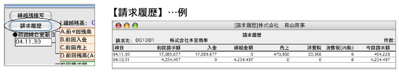 ●請求書を本発行すると、得意先残高に請求書のデータが書き込まれます。(本発行で請求書を出力した都度書き変わります)書き込まれたデータは締日更新を行った時点で、『請求履歴』の中に移行され履歴としていつでも見る事ができます。