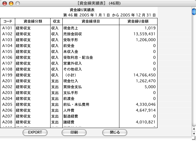 現預金の入出金を、相手科目の分類(勘定科目登録画面の資金繰実績区分)により集計するメニューです。