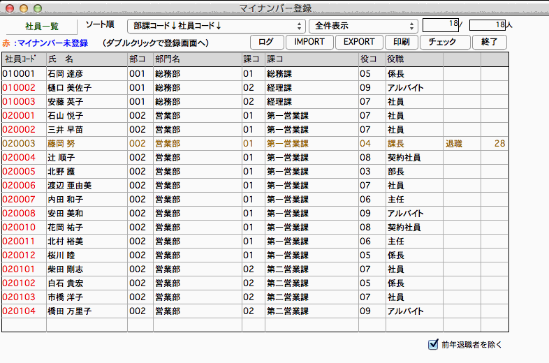 前年退職者は、最初は表示されませんが、チェックを外すと、前年退職者も一覧に表示されます。(労働保険料賃金集計表出力時に必要である為、前年退職者の社員情報やマイナンバーは、年次更新の時に削除されません。)