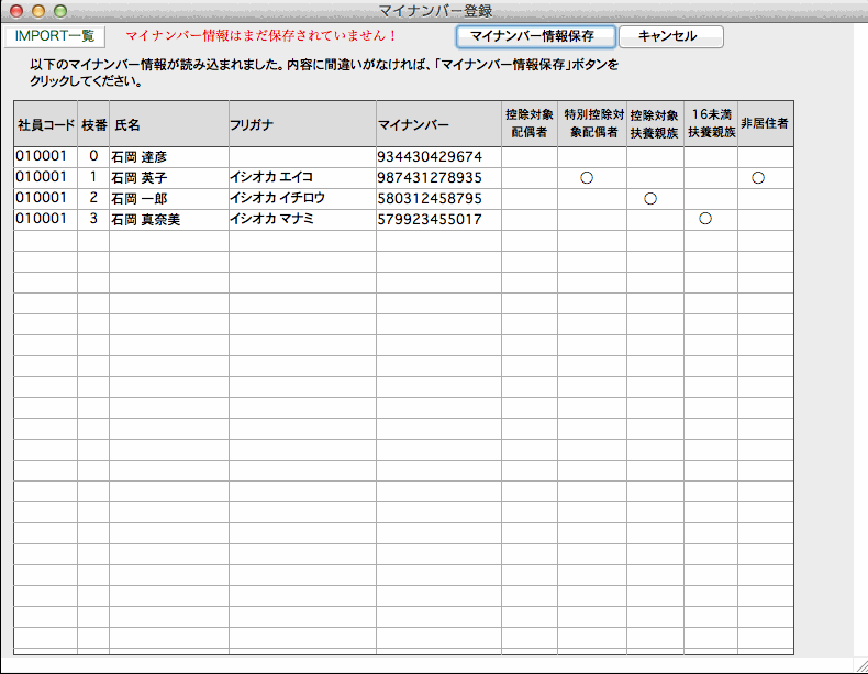 マイナンバーのデータを外部ファイルに保存している場合、IMPORTすることができます。社員一覧の「IMPORT」ボタンをクリックします。(必ず給与データのバックアップコピーをとってから行ってください。)