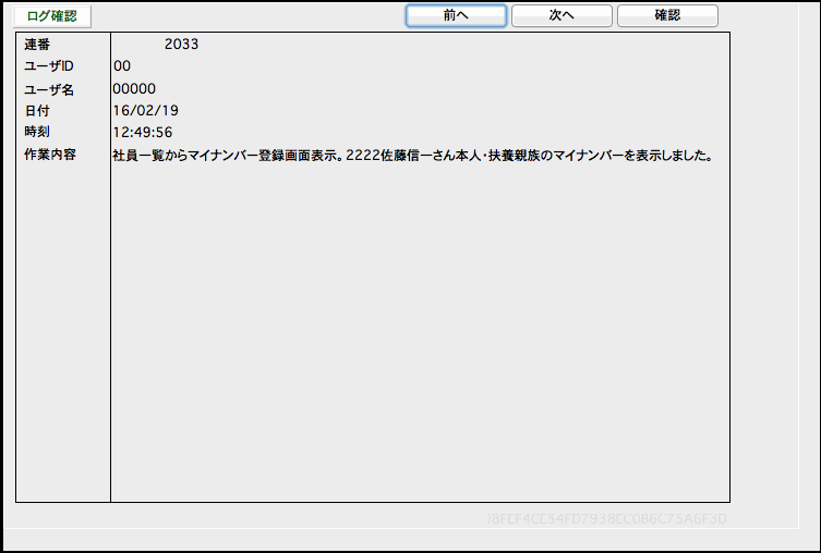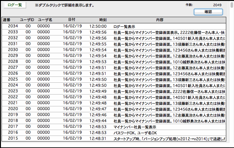 マイナンバー登録に関する操作履歴を見ることができます。「内容」の文字数が多く一覧に表示しきれない場合、ダブルクリックで確認できます。