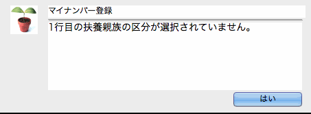 扶養親族区分の「○」がどの項目にもついていない場合、メッセージを表示します。