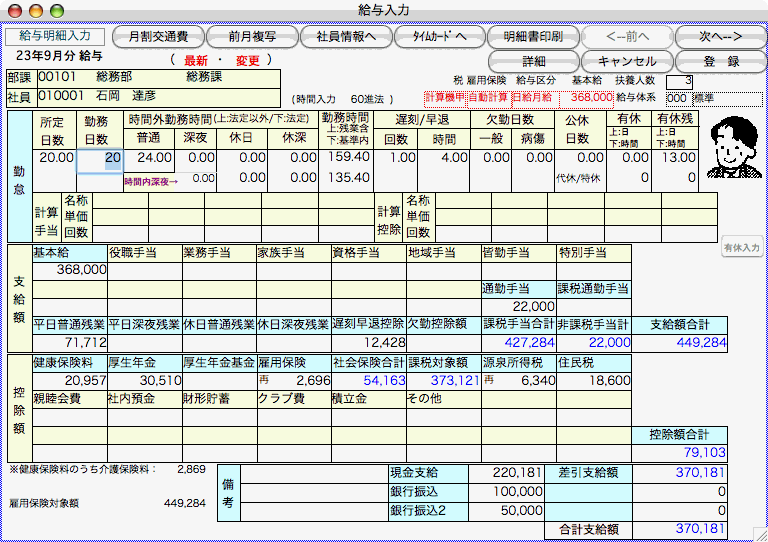 今までに処理済の月の中で最も新しい(数字の大きな)月の処理をしている時です。この時には、社会保険料・源泉所得税・残業手当・欠勤控除・遅刻早退控除・現金,振込1,振込2の計算がすべて自動で行なわれます。その他、次の処理が行なわれます。