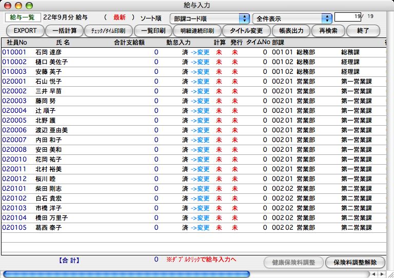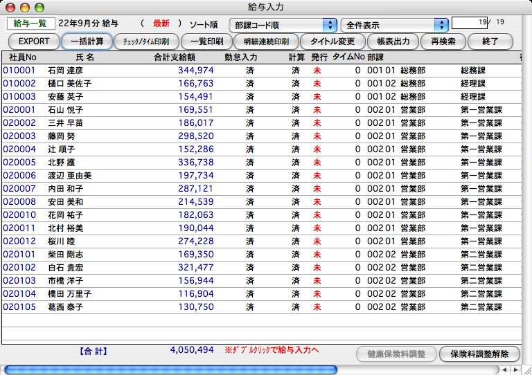 ・入力済みの勤怠データを、最新の社員情報を元に、表示中の全員について給与計算が行われます。
