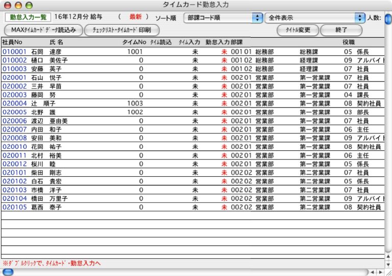 MAXタイムレコーダーのCSVファイルの読込みができます。打刻1〜打刻6の最大6回の打刻から、自動的に出勤、退勤時刻、外出再入時刻(外出再入1回の場合のみ)を判断します。また、タイムカードデータを手入力した時と同じように、実働、早出、外出、残業、遅刻早退時間を自動計算します。(2回以上外出がある場合は、外出再入時刻は入らず、合計外出時間だけ算出されます。)