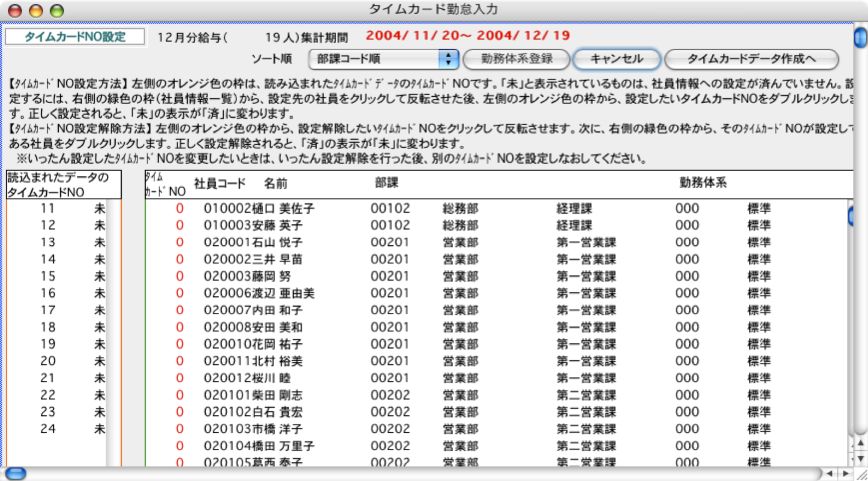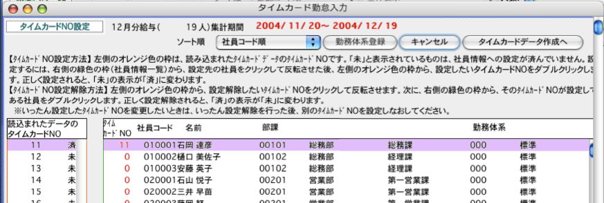 6.読込まれたタイムカードデータのNOと、社員情報の対応付け画面が表示されます。