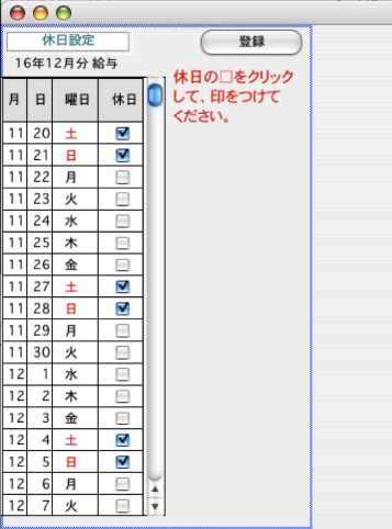 8.当月のタイムカードデータ読込が初めてで、タイムカードデータ手入力も全く行っていない場合は、次に休日設定画面が表示されます。会社の休日に、チェックします。ここでチェックされた日に出勤した場合、休日出勤とみなされます。チェックし終えたら、「登録」ボタンをクリックします。