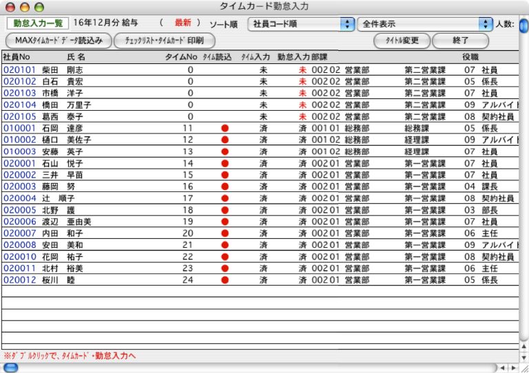 9.タイムカードデータの作成が終わると、元の勤怠入力一覧に戻ります。今回読込まれたデータには、●印がついています。画面上部の「全件表示」を、「タイムカード読込み社員のみ表示」に切り替えることができます。