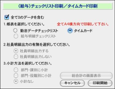 10.タイムカードを連続印刷するには、「チェックリスト・タイムカード印刷」ボタンをクリックします。帳表の選択で、タイムカードを選んでください。用紙はA4横方向で印刷して下さい。