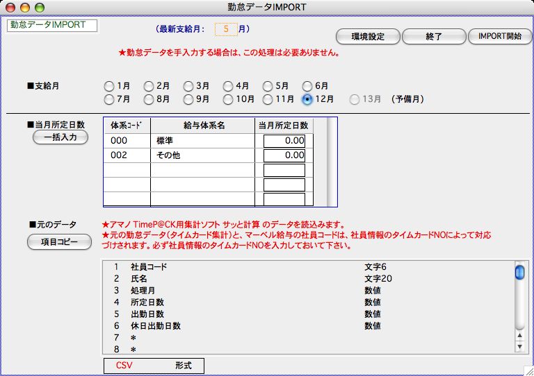 3.支給月を選択し、当月所定日数を入力します。次に、「IMPORT開始」ボタンをクリックします。