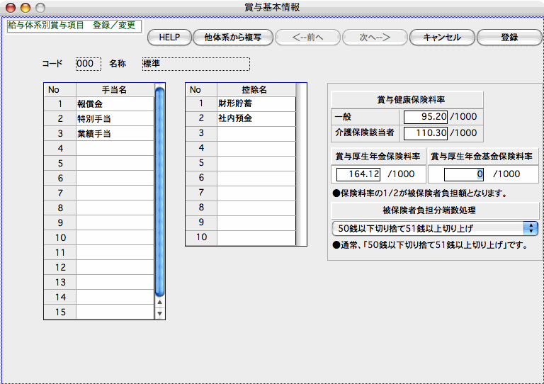 ここでは、15の給与体系別賞与手当名と、10の給与体系別賞与手当名が設定できます。また、賞与健康保険料率や、賞与厚生年金保険料率、賞与厚生年金基金率を設定し、被保険者自己負担分の端数処理方法を選択します。