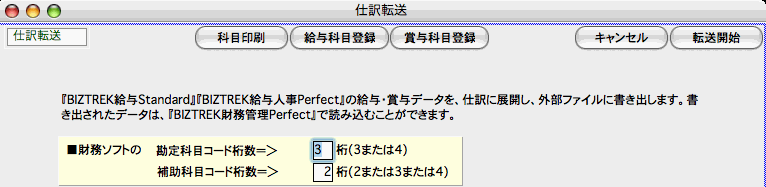 1.その他メニューから「仕訳転送」を選択すると、仕訳転送画面が表示されます。ここから「給与科目登録」ボタンをクリックします。
