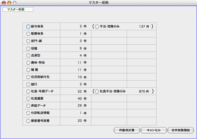 給与体系や、部門、役職、自由設定項目、住民税納付先、社員情報等のマスターの全件削除を行ないます。