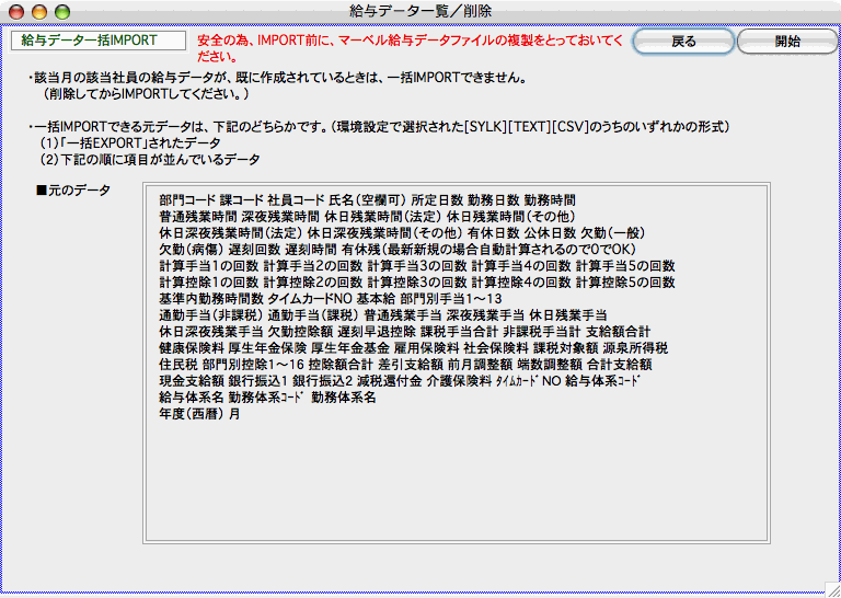 ※「一括IMPORT」:「一括EXPORT」された給与データまたはそれと同じ項目順で保存されたデータを読み込みます。