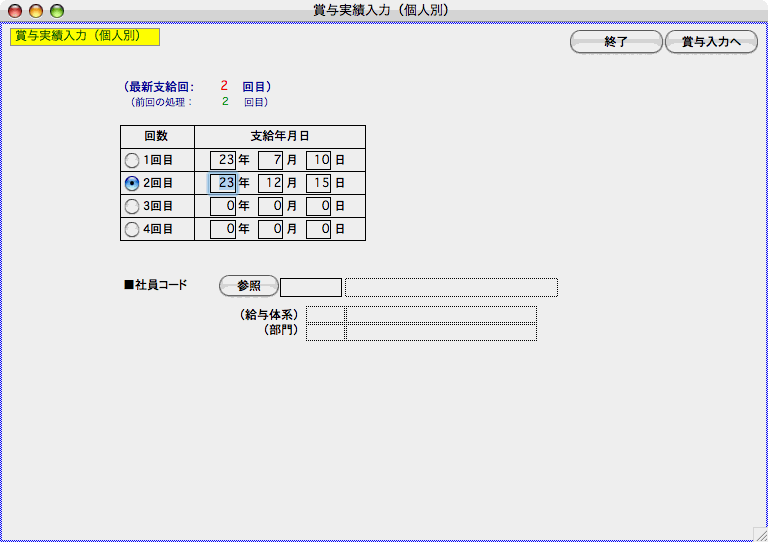 3.「賞与入力へ」ボタンをクリックすると、賞与実績入力画面が表示されます。画面や操作方法は、「4.賞与入力 ■2.賞与入力の手順」と同じです。