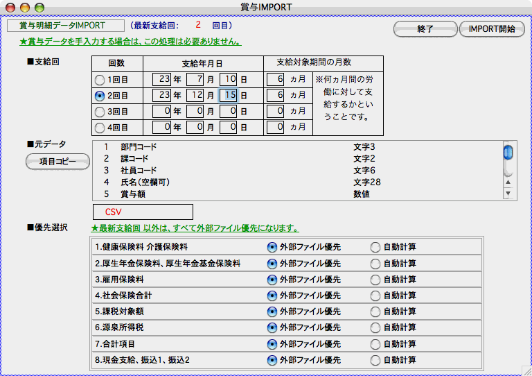 それぞれの項目について、「外部ファイル優先」と「社員情報から適用」のどちらか、または、 「外部ファイル優先」と「自動計算」のどちらか、を選択します。