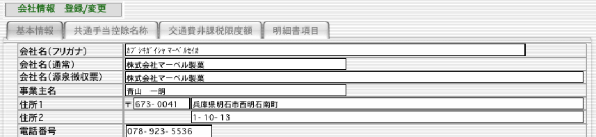 3.「会社情報」の会社名、住所、電話番号等未入力や変更箇所があれば、入力します。「会社名(源泉徴収票)」を、必ず登録してください。(源泉徴収票の会社名欄には、この内容が印字されます。)