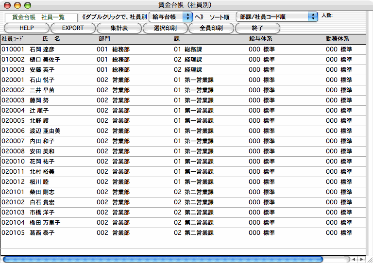 3の賃金台帳(社員別)の作成手順に従い、社員の一覧を画面に表示させます。