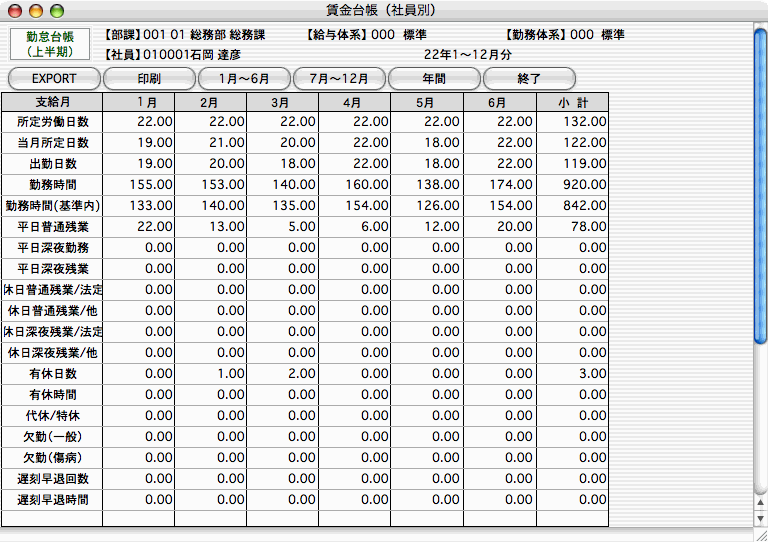 2.勤怠台帳:1月〜12月までの勤怠データを、項目別に一覧表示、印刷します。