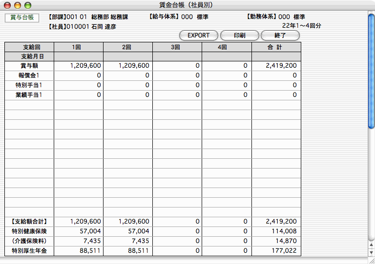 1.給与台帳:1月〜12月までの給与の支給実績を、項目別に一覧表示、印刷します。