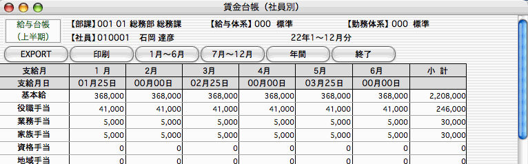 賃金台帳のうち、1〜6月分が表示されます。