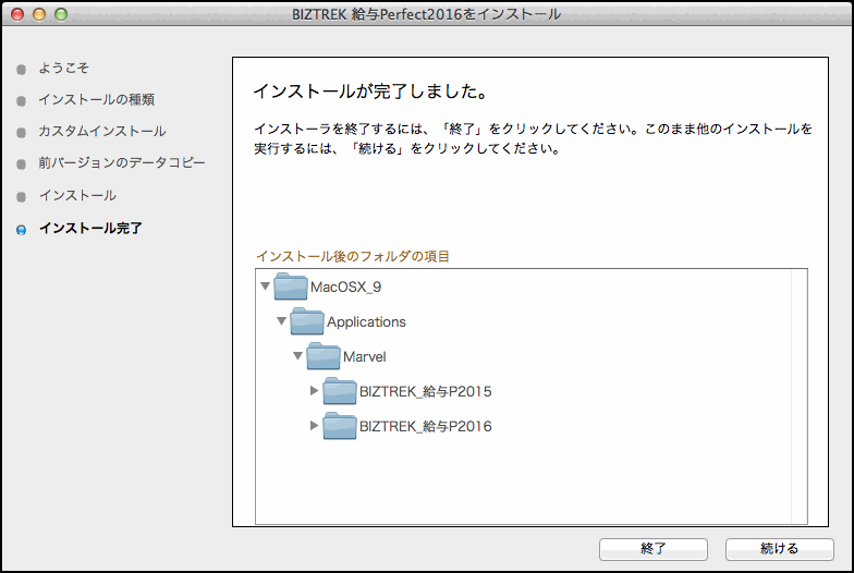 8. ●Mac版:「MacintoshHD」→「アプリケーション」フォルダ→「Marvel」フォルダ→「BIZTREK_給与P(給与S)2016」フォルダが新しく作成されているはずです。