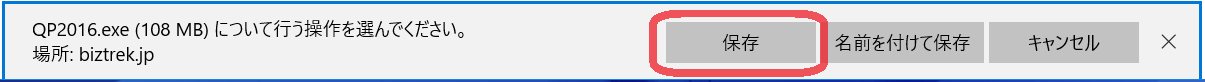 2.しばらくして、ダウンロード用圧縮ファイル(「QP2016exe」)のダウンロードが終わると、下図ウィンドウが表示されますので「実行」をクリックします。