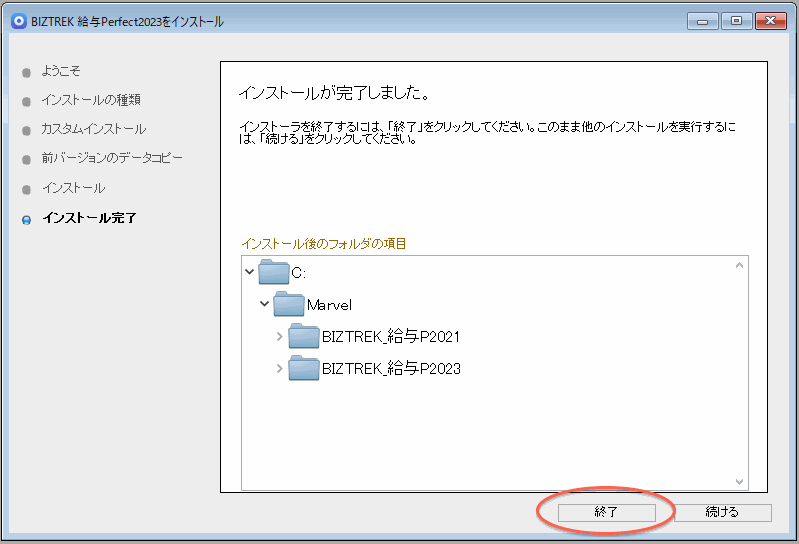 (Windows版) 「ローカルディスクC」→「Marvel」→「BIZTREK給与P(S)2021」→「DATA」フォルダの中に保存されていれば、v2021給与データを、今回インストールして作成される v2023の「DATA」フォルダへ自動的にコピーする事ができます。この場合、次のような画面が表示されます。