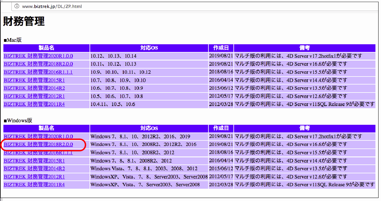 ■Windows版-製品名「BIZTREK_財務管理V2018R2.0.0」をクリックします。