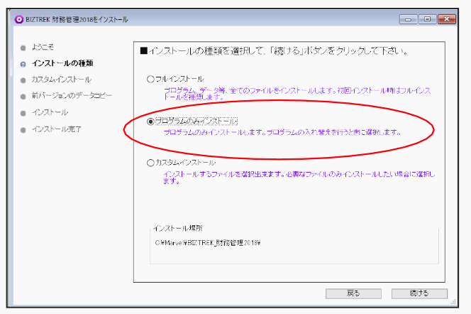 6.インストールの種類を選択する画面が表示されます。「プログラムのみインストール」を選択し、「続ける」ボタンをクリックします。